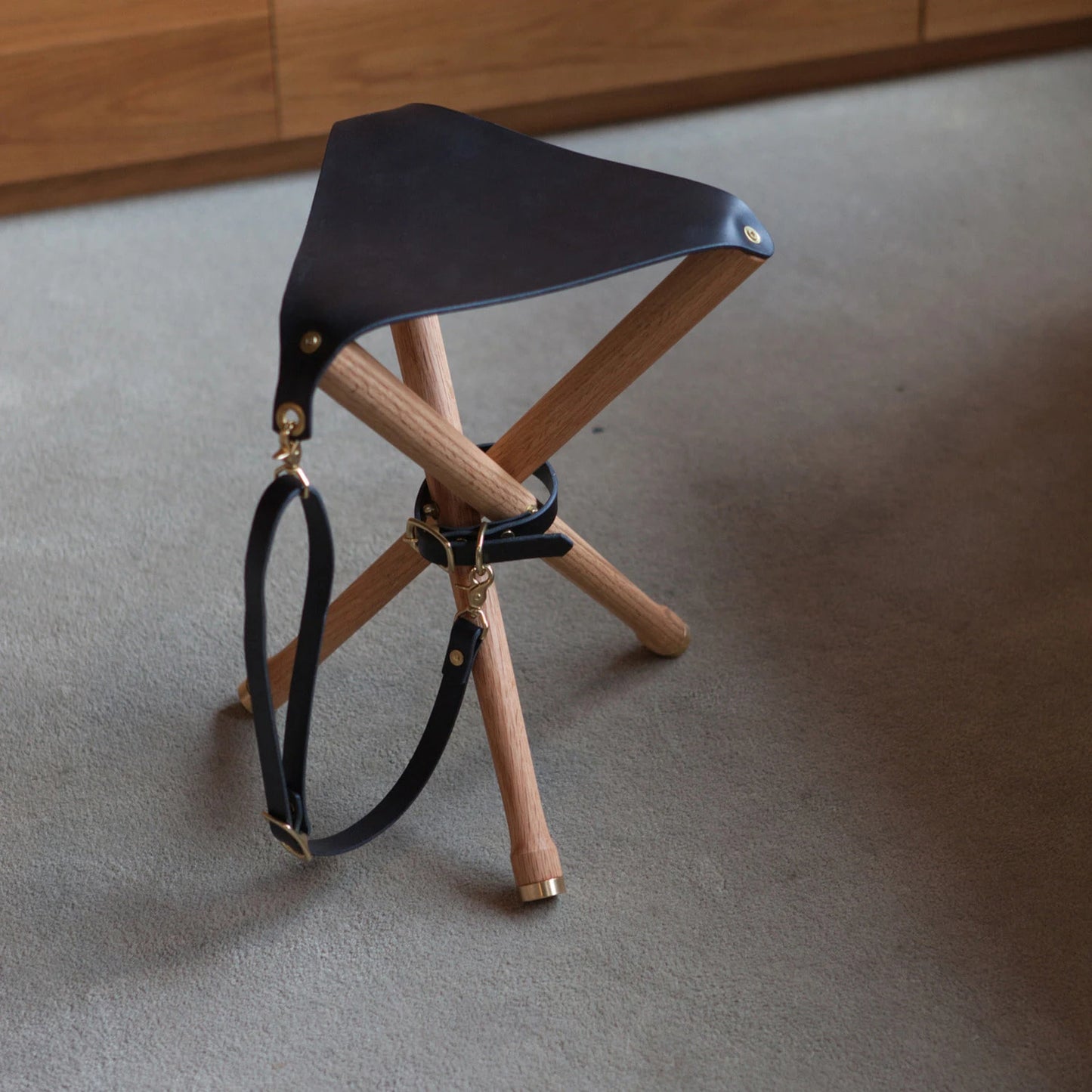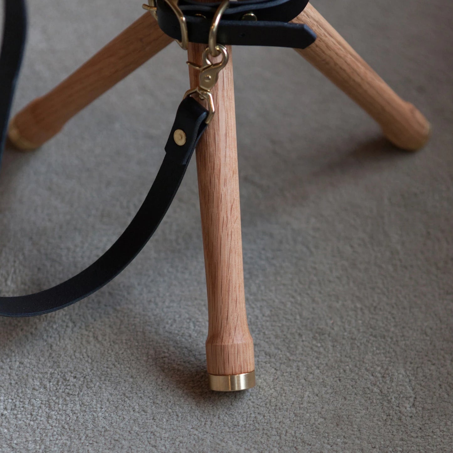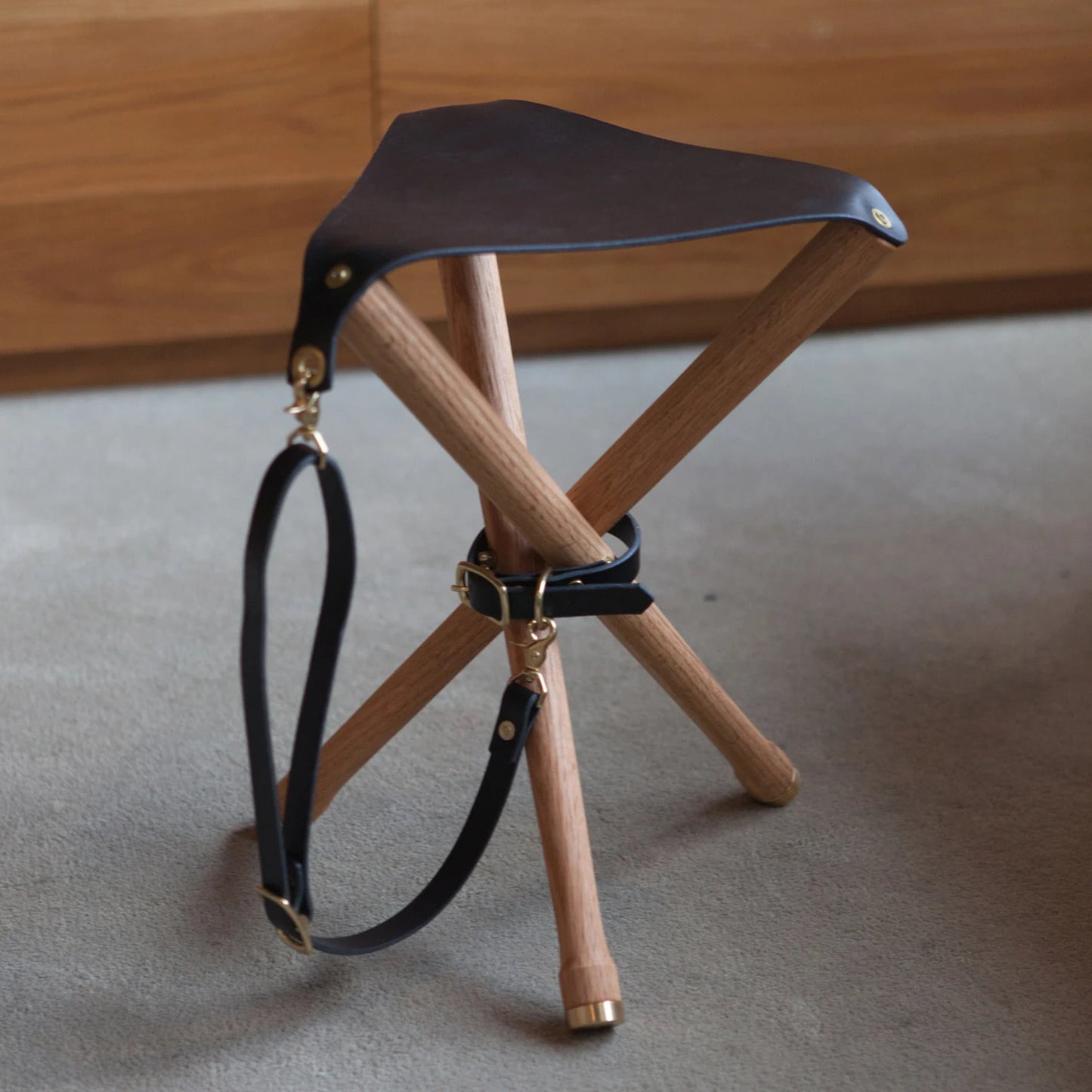 3개의 원목 다리가 교차되는 디자인으로 지면이 고르지 못한 아웃도어에서 사용이 가능하도록 실용성을 높이고 버클로 길이 조절 가능한 가죽 스트랩으로 휴대성을 더했습니다.